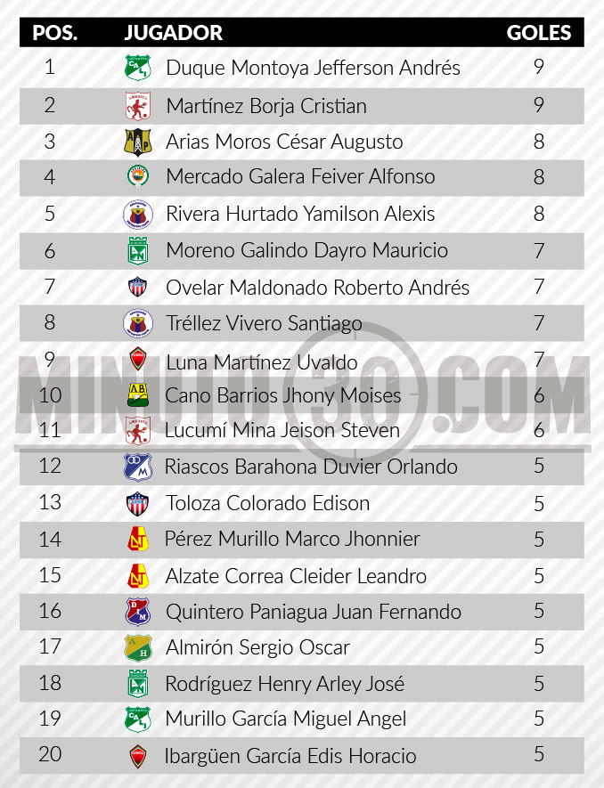 La tabla de artilleros de la Liga Águila I-2017 marcha sin mayores cambios al término de la fecha 18.