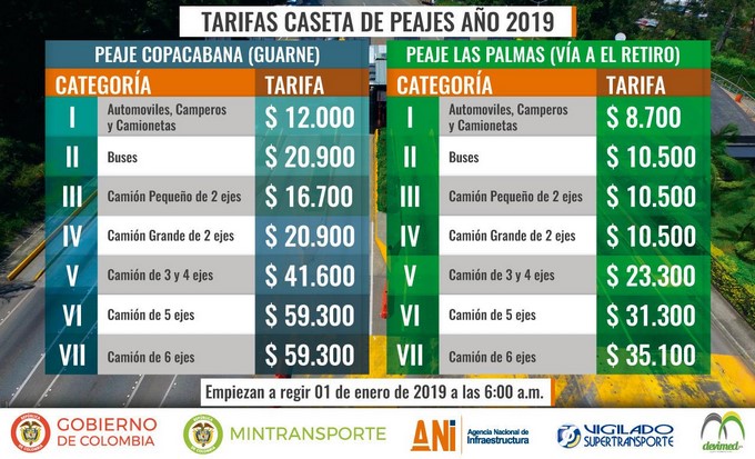 Se dieron a conocer las tarifas de pago de los peajes ubicados en Copacabana (Guarne) y Las Palmas (por El Retiro) en el Oriente de Antioquia para el 2019.
