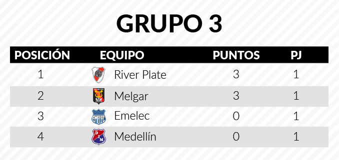 Por su parte, Independiente Medellín, que cayó 1-3 ante River Plate, quedó de último en el grupo 3 tras la primera jornada.