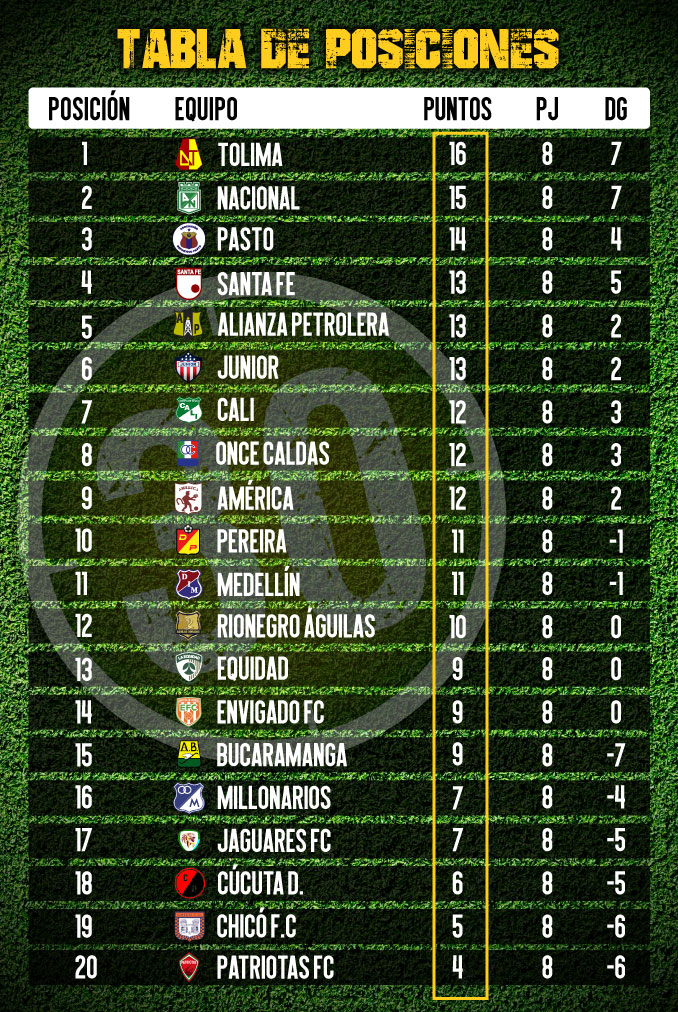 El grupo de los ocho lo completan en su orden: Independiente Santa Fe, Alianza Petrolera, Atlético Junior, Deportivo Cali y Once Caldas.