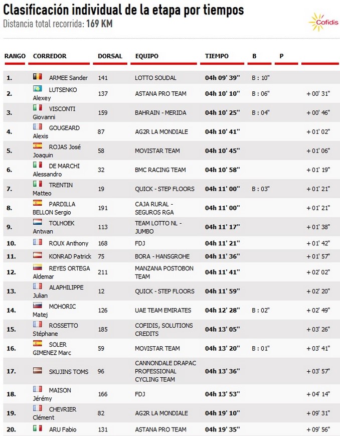 Vale la pena mencionar, respecto a la facción de hoy, el arribo del colombiano Aldemar Reyes Ortega, del equipo Manzana Postobón, en el duodécimo puesto.