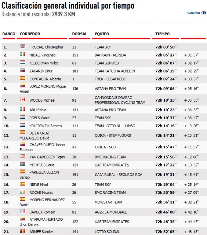 Tres colombianos se mantiene entre los 20 primeros de la clasificación general de la Vuelta a España, luego de la decimoctava etapa que se cumplió este jueves entre Suances y Santo Toribio de Liébana, de 169 kilómetros.