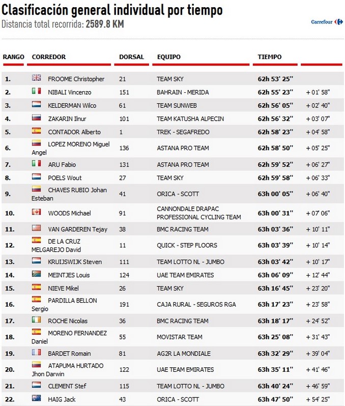 Por su parte, Esteban Chaves descendió al noveno lugar, a 6’40” de la cima de la clasificación.