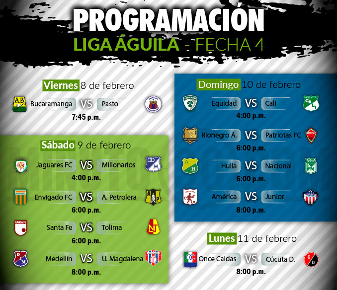 La Dimayor dió a conocer cómo se jugará la cuarta fecha de la Liga Águila, que comenzará a disputarse desde el próximo viernes 8 de febrero en el estadio Alfonso López, cuando Atlético Bucaramanga reciba a Deportivo Pasto.