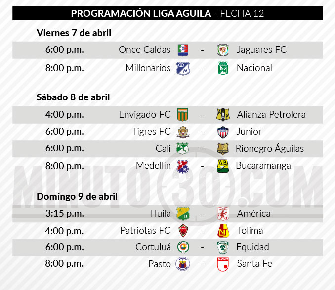 Por su parte, Atlético Nacional visitará a Millonarios en el Estadio El Campín, en juego programado para las 8:00 de la noche.