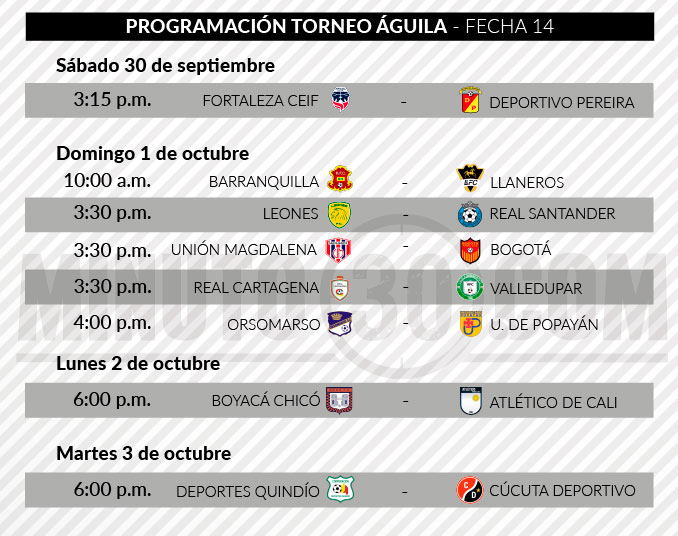 Entre este sábado 30 de septiembre y el próximo martes 3 de octubre se cumplirá la fecha 14 del Torneo Águila, que en el cierre tendrá el duelo entre dos de los tradicionales que buscan ascender, Deportes Quindío y Cúcuta Deportivo.