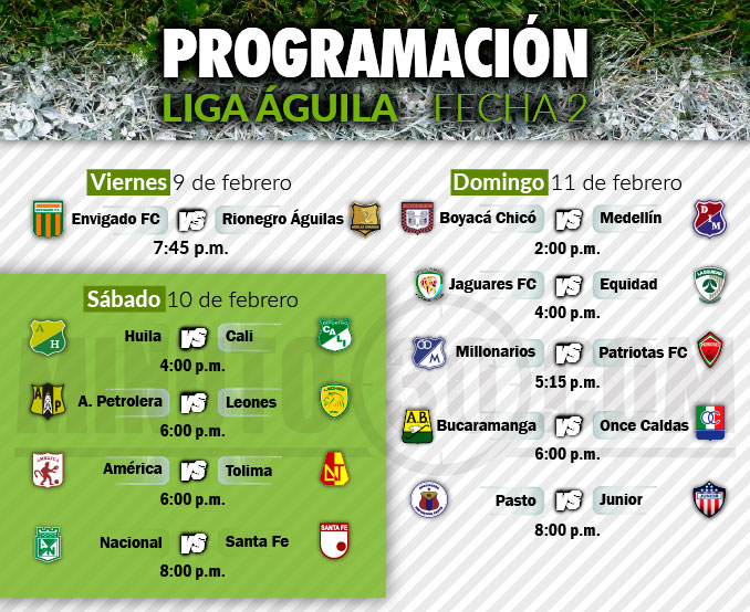 La fecha 2 de la Liga Águila I-2018 comenzará el viernes 9 de febrero con partido de antioqueños entre Envigado y Águilas de Rionegro.