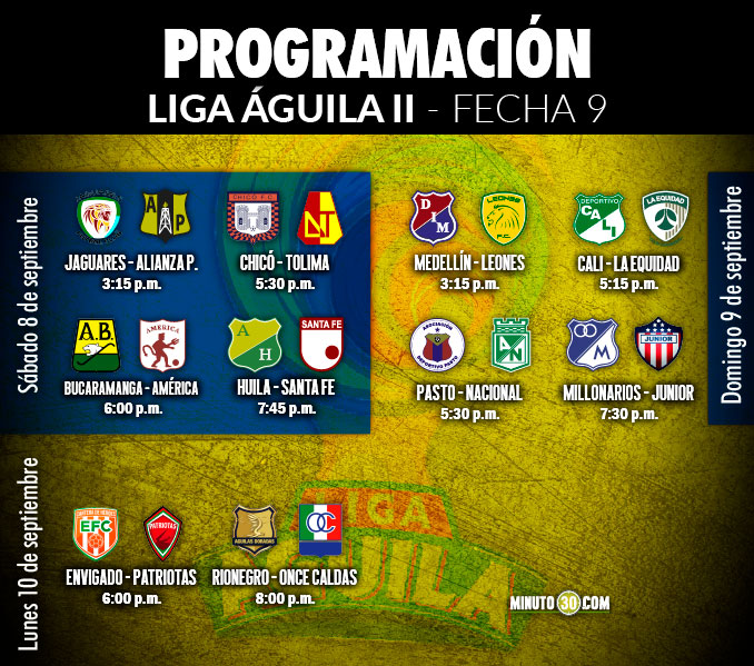 Minuto30.com- La Dimayor dio a conocer la programación de la novena fecha de la Liga Águila II-2018, que se diputará entre el sábado 8 y el lunes 10 de septiembre.