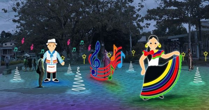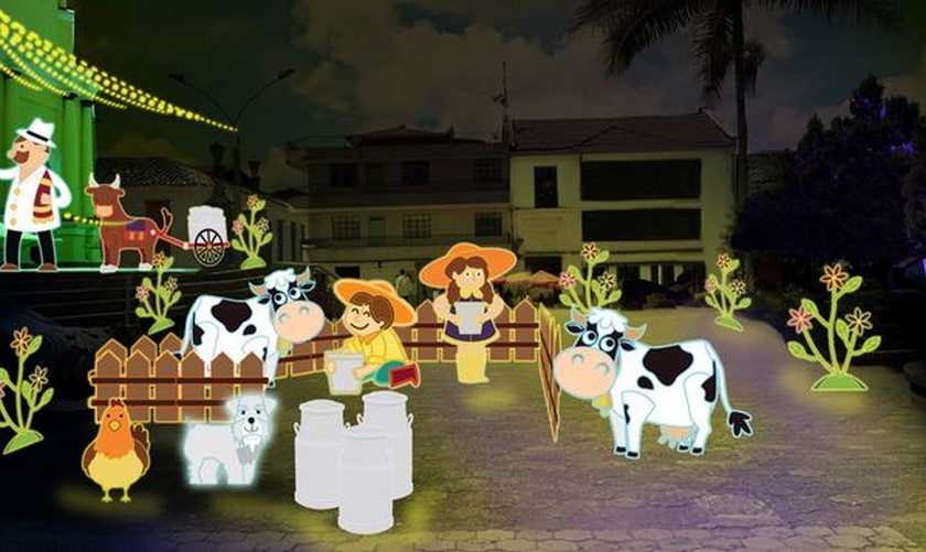 Tarazá: el folclor colombiano se verá en este Alumbrado, con figuras de piso de bailarines y notas musicales. En la calle 30 y en la entrada de la Iglesia Principal se instalará un techo luminoso.