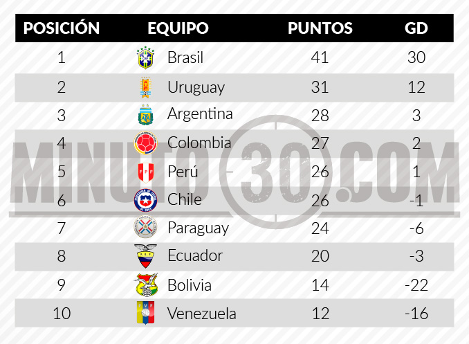 Por su parte, Uruguay, se quedó con el segundo lugar, con 31 unidades; Argentina fue tercero con 28; y Colombia cerró el grupo de los clasificados de forma directa, con 27 unidades.