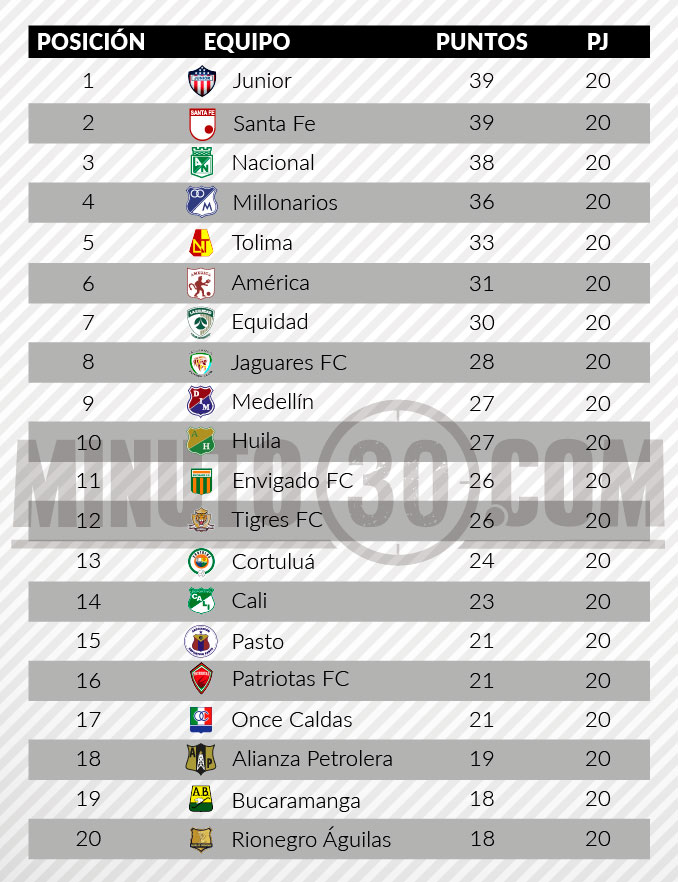 Por su parte, Atlético Nacional se quedó en 38 y tras su empate con Independiente Medellín debió resignarse con el tercer lugar.