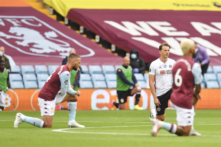 Los jugadores del Aston Villa y el Sheffield United hincaron este miércoles la rodilla, antes del comienzo de su partido, por el movimiento contra el racismo “Black Lives Matter”.