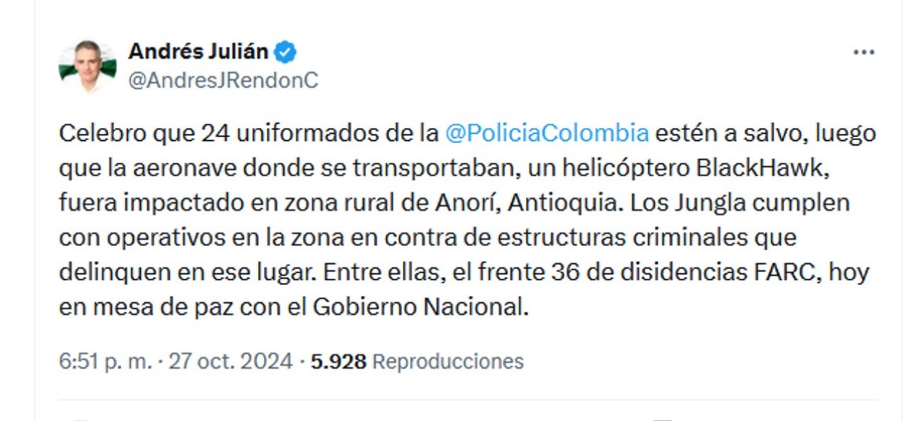 Minuto30.com .- Un helicóptero Black Hawk de la Policía Nacional, que transportaba a 24 uniformados, fue impactado en zona rural de Anorí; según confirma el gobernador de Antioquia Andrés Julián Rendón.