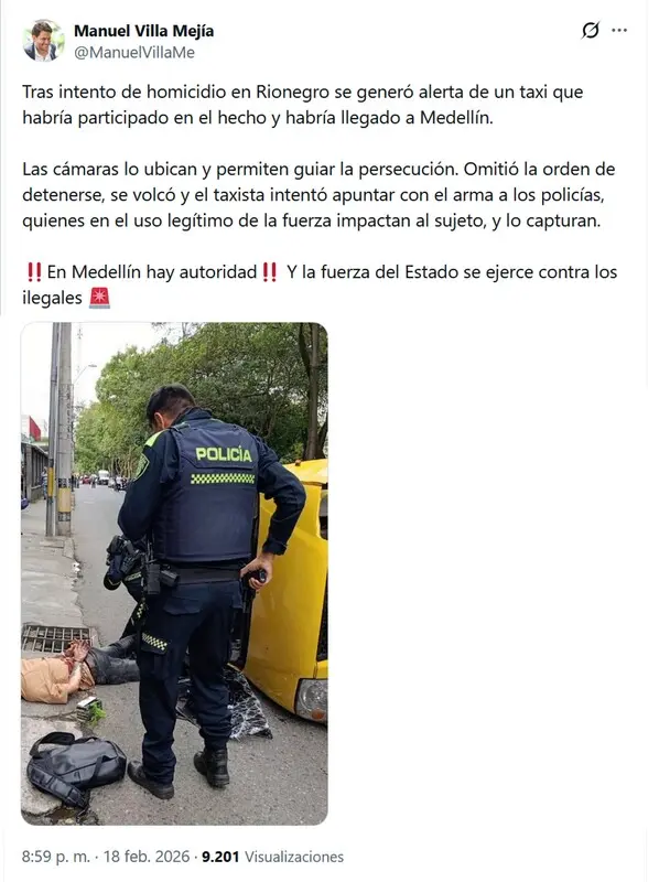 La persecución terminó en la Avenida Regional con calle 25, donde el taxi colisionó con otro vehículo y terminó volcado sobre la vía. Según el secretario de Seguridad de Medellín, Manuel Villa Mejía, el sujeto no se rindió tras el choque: