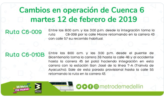 A través de las redes sociales el Metro de Medellín anunció modificaciones en el recorrido de las rutas alimentadoras C6-009 y C6-010B, esto por motivo de la realización de la primera etapa del Tour Colombia 2.1.