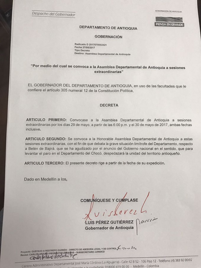 El gobernador de Antioquia, Luis Pérez Gutiérrez, convocó a la Asamblea Departamental a sesiones extraordinarias, dichas sesiones se adelantarán los días 29 y 30 de mayo luego de las 6 de la tarde.