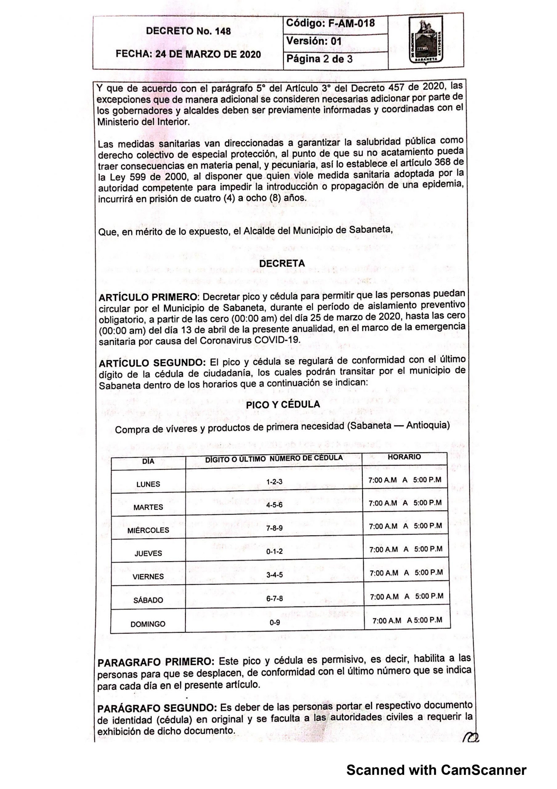 Este control funciona, permitiendo el tránsito por Sabaneta, según los últimos números de la cédula de ciudadanía y el día de la semana. Con el fin exclusivo de comprar alimentos, bebidas, medicamentos, implementos de aseo; también para el tránsito hasta entidades bancarias y centros de salud: