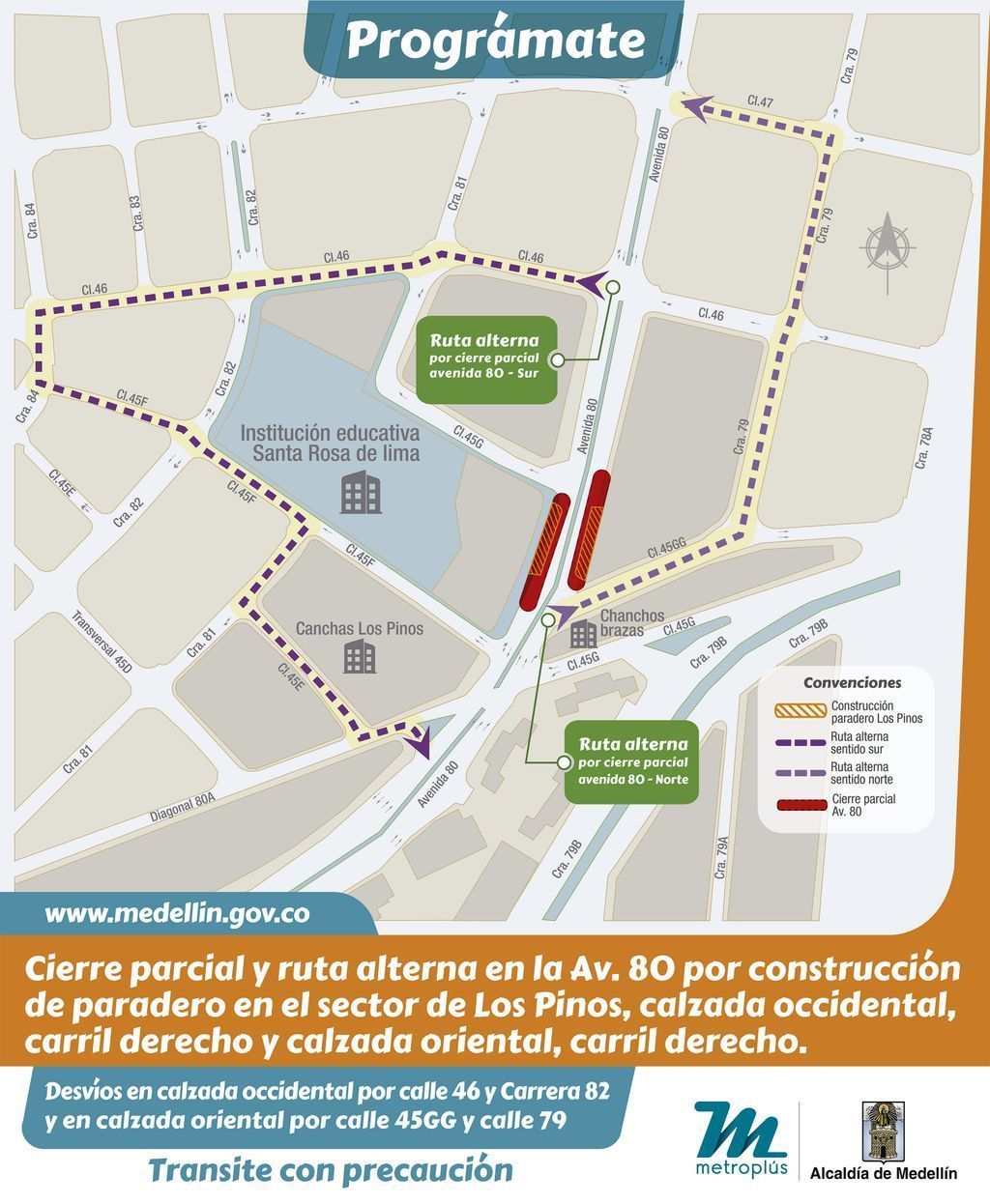 El desvío de la Av. 80, sector Los Pinos, será sentido sur-norte, por la calle 45 GG y carrera 79, sentido norte sur por la carrera 46 y calle 82.
