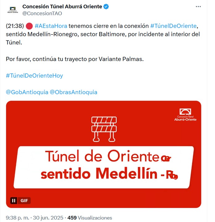 Minuto30.com .- La Conexión Túnel de Oriente presenta un cierre total en el sentido Medellín-Rionegro desde las 9:38 p.m. de este lunes 30 de junio. La interrupción se debe a un incidente ocurrido al interior del túnel, específicamente en el sector Baltimore, según informó la Concesión Túnel Aburrá Oriente (@ConcesionTAO).