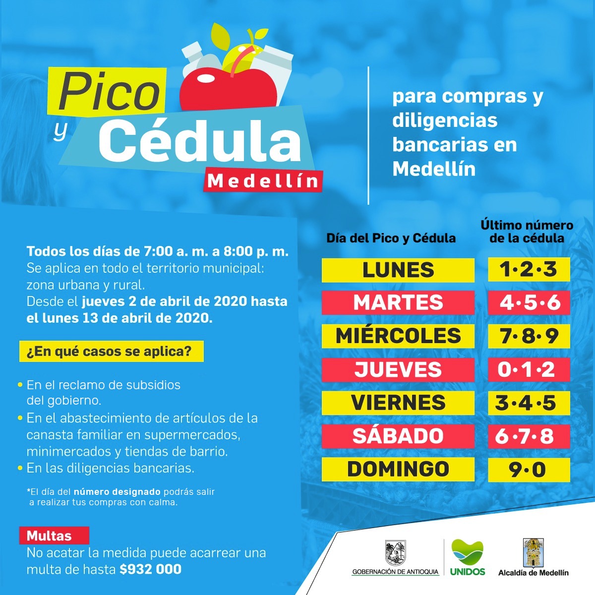 La Alcaldía de Medellín decidió implementar la medida del pico y cédula que comenzará a regir desde las cero horas del jueves 2 de abril para que los ciudadanos puedan abastecerse durante los días de la medida nacional adoptando el decreto 457 de 2020 con el fin de aminorar el contacto entre las personas.