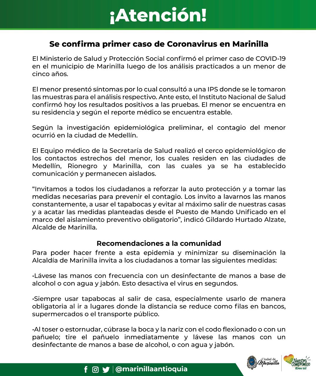 Aquí el comunicado completo de la Alcaldía de Marinilla.