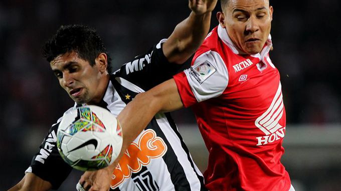El jugador de Santa Fe Luis Carlos Arias (d) disputa el balón con Guilherme (i), de Atlético Mineiro, durante el partido por la Copa Libertadores. EFE