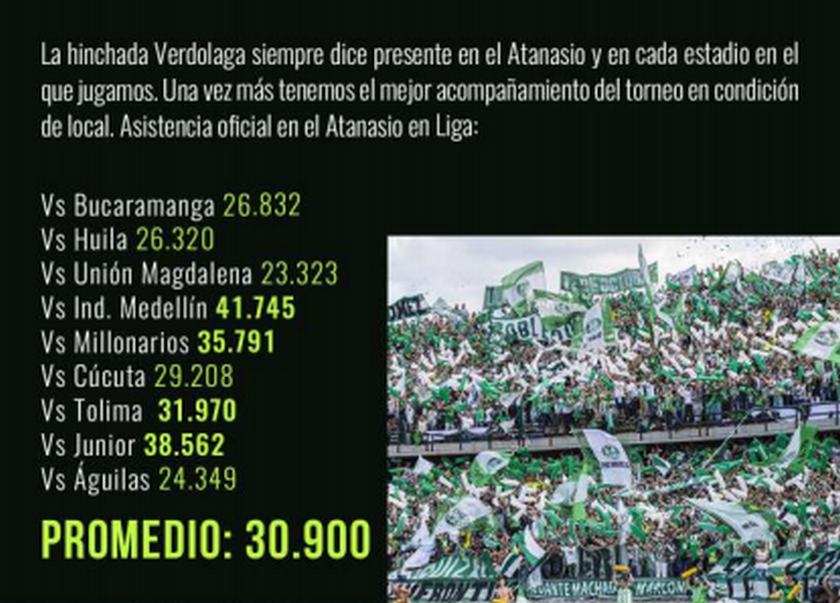 Así ve reflejado en una publicación del conjunto antioqueño, en la que se referencia el número de espectadores que ha asistido a cada partido en el ‘Coloso de la 74’, lo que ha desencadenado en un promedio de 30.900 espectadores por juego.