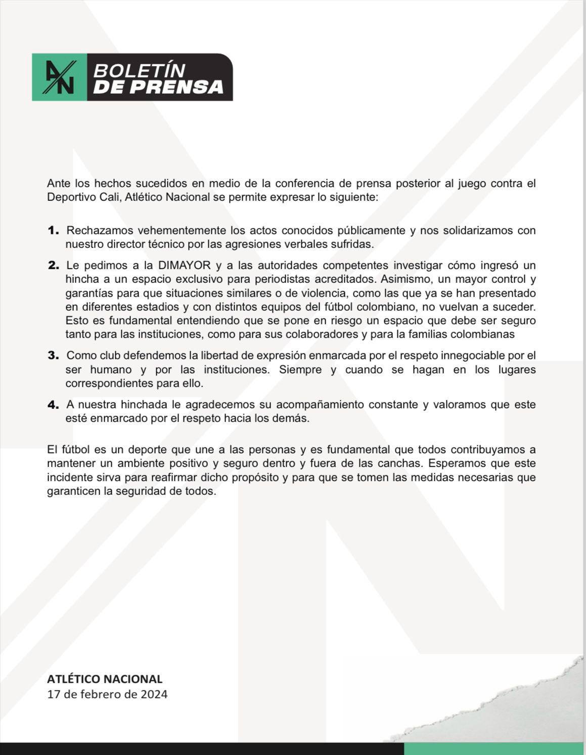 En ese mismo sentido, Atlético Nacional exigió “un mayor control y garantías para que situaciones similares o de violencia no vuelvan a suceder”.