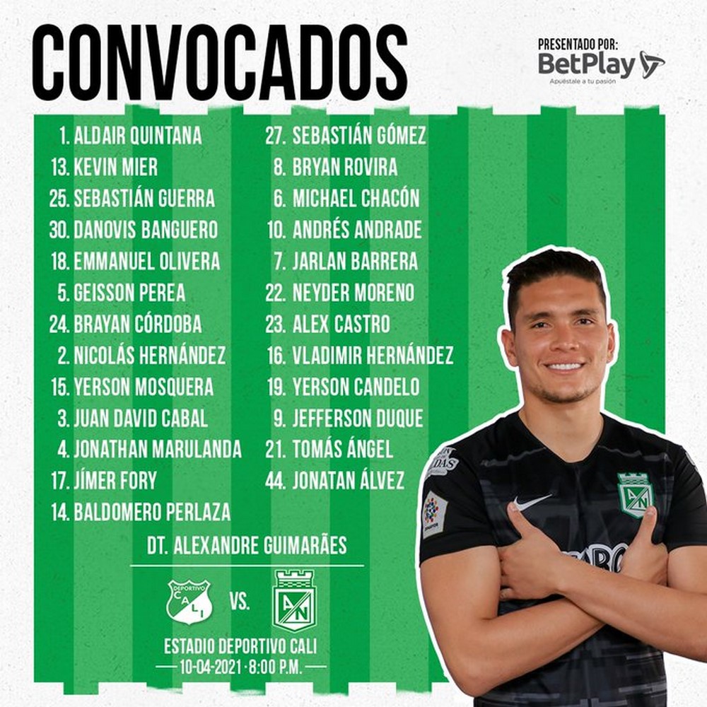 📋 Estos son los elegidos por el profe para el partido de mañana frente a Deportivo Cali en el estadio Palmaseca #SoyDelVerdeSoyFeliz ⚽🇳🇬 pic.twitter.com/RZOG2Iiw3O