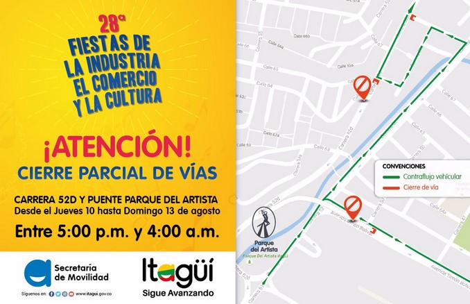 Por lo anterior, la Secretaría de Movilidad anunció que del 10 al 13 de agosto se hará el cierre parcial de la carrera 52D entre las calles 65 y 60, así como el ingreso al puente del Artista, vías que comunican a Envigado y Medellín con la zona centro de este municipio. Asimismo aclaran que “en aras de afectar lo menos posible la movilidad, el cierre solo se hará horas antes del inicio del evento, aproximadamente a partir de las 5.00 p.m., y se abrirá la vía todos los días apenas termine el mismo”, asegura Sebastián Zuluaga, subsecretario de Movilidad de Itagüí.