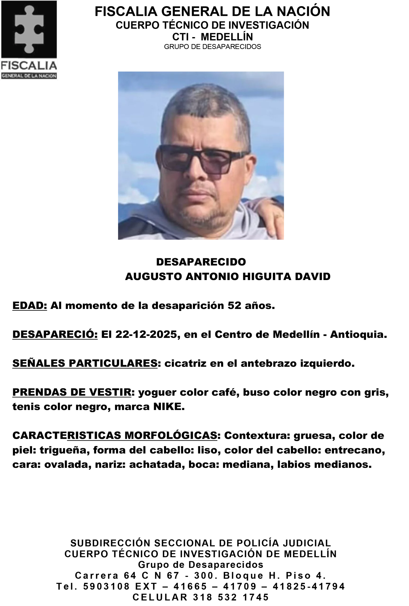 Resumen: Augusto Antonio Higuita David, de 52 años, desapareció el 22 de diciembre de 2025 en el centro de Medellín, Antioquia.