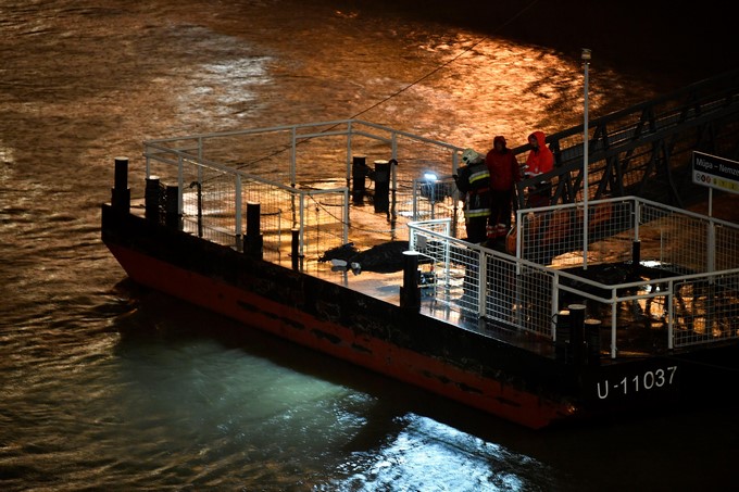 Miembros de la policía y rescatistas trabajan en las labores de búsqueda de varios desaparecidos tras el accidente de un barco con 34 turistas a bordo este miércoles, en el río Danubio, a la altura de Budapest (Hungría). EFE