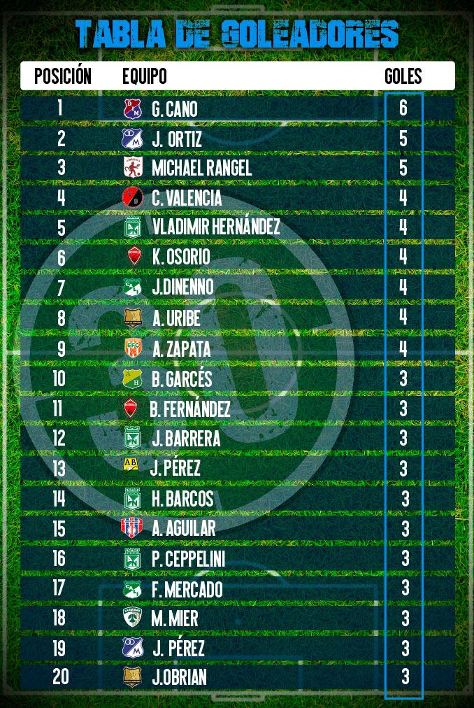 Entre los que este fin de semana engrosaron la lista de los que llevan cuatro figuran: Carmelo Valencia, con su doblete en el Atanasio, frente a Nacional; Vladimir Hernán, quien anotó el segundo de su equipo en la derrota frente al ‘Motilón’ ; y Alexis Zapata, quien logró el gol de la fecha en el Polideportivo Sur, con un zurdazo desde aproximadamente 35 metros.