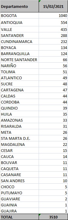 43.789 casos activoshttps://t.co/SiKTpTCQ3W pic.twitter.com/5Mnmx51JnB— MinSaludCol (@MinSaludCol) February 15, 2021