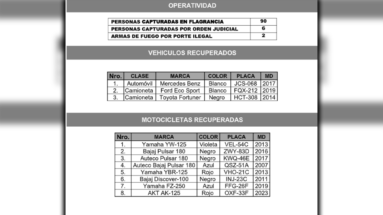 Además, reportaron la captura de 90 personas por flagrancia, 6 personas por orden judicial y 2 personas por porte ilegal de armas.