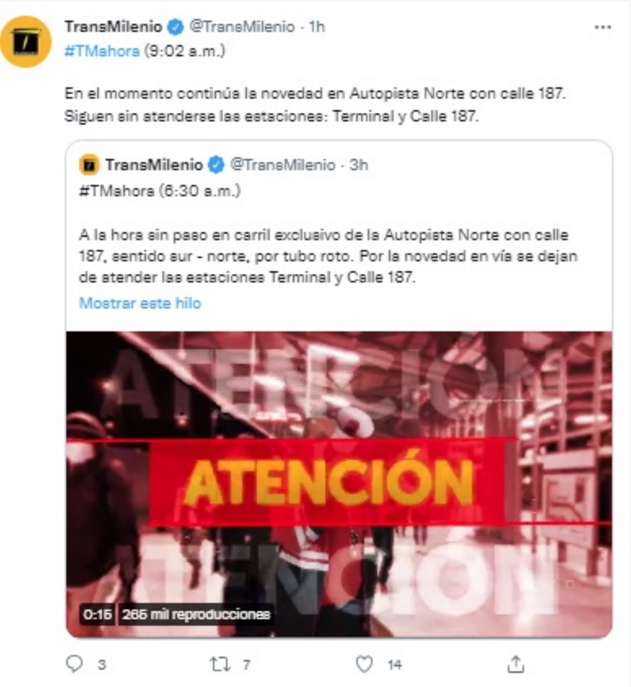 Transmilenio reportó que no hay paso en carril exclusivo de la Autopista Norte con calle 187, sentido sur – norte, por la ruptura del artefacto. Además, anunciaron que dejan de atender las estaciones Terminal y Calle 187.