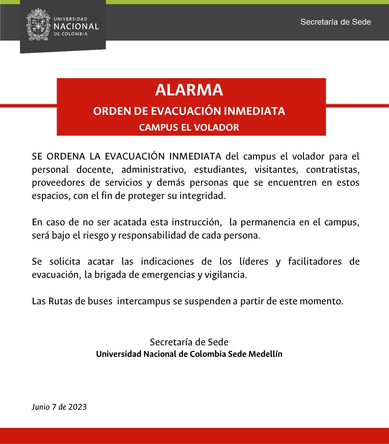 Debido a los disturbios, la universidad Nacional ordenó por medio de un comunicado la evacuación inmediata del campus El Volador con el fin de proteger la integridad de los estudiantes, visitantes, contratistas y proveedores de servicios.