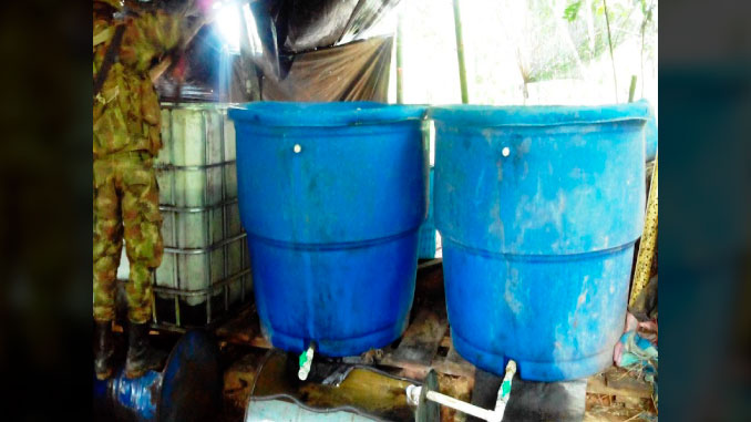 En el sitio se hallaron 220 galones de pasta base de coca en proceso, 200 kilogramos de cemento, 792 galones de gasolina, 60 galones de ácido sulfúrico, cuatro canecas de 55 galones, 80 kilogramos de permanganato de potasio de sodio, 80 kilogramos de soda cáustica, seis canecas de 55 galones con tiner, tres tanques plásticos, cinco canecas de 55 galones con hoja picada en proceso y un motor con ensamble para picar hoja.