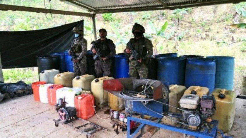 En su interior fueron hallados dos semilleros con 60.000 plantas de coca, 1.490 galones de pasta base de coca en proceso, 1.125 kilogramos de hoja de coca macerada, 2.570 galones de gasolina, 200 kilogramos insumos sólidos, dos picadoras de hoja industriales, tres prensas, cuatro motobombas, una estufa industrial, una embarcación en fibra de vidrio, entre otras herramientas empleadas para la producción de estupefacientes.
