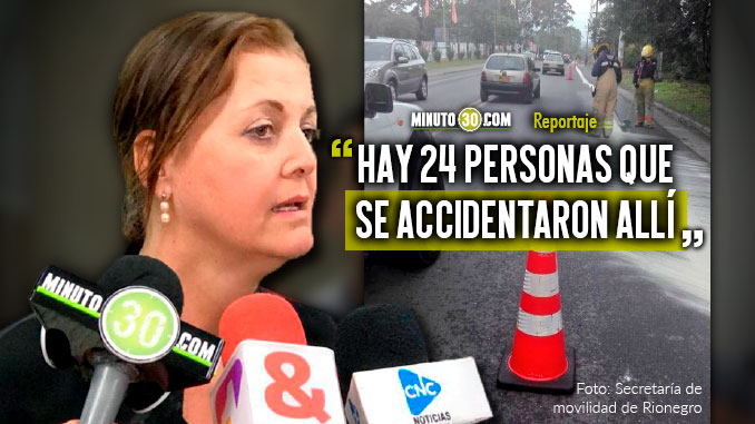 En el municipio de Rionegro en la vía hacia San Antonio, un derrame de aceite provocó cerca de 24 accidentes a personas que transitaban por esta vía y las cuales fueron trasladadas a las clínicas del municipio, sobre el hecho, la Secretaria de Gobierno de Antioquia, Victoria Eugenia Ramírez, expresó que se analizará, en coordinación con las autoridades, el origen de dicho derrame.