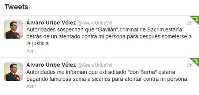 Alvaro uribe acaba de enviar dos mensajes de twitter en los que denuncia un posible plan para asesinarlo: ‘Autoridades me informan que extraditado “don Berna” estaría pagando famulosa suma a sicarios para atentar contra mi persona’ ‘Autoridades sospechan que “Gavilán”,criminal de Bacrim, estaría detrás de un atentado contra mi persona para después someterse a la justicia’.