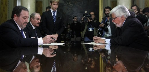 El presidente de la Suprema Corte de Justicia de Uruguay,Jorge Chediak (frente-i), el director general de los Servicios Administrativos del Poder Judicial Elbio Méndez (atrás-i), y el ministro uruguayo del Interior, Eduardo Bonomi (frente-d) son vistos este 11 de mayo durante la firma de un convenio entre la Suprema Corte de Justicia y el ministerio del Interior en la sede del Poder Judicial en Montevideo (Uruguay). EFE