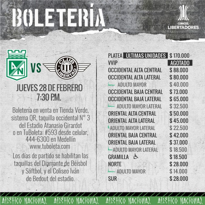 Minuto30.com- Más de 30.000 personas se espera asistan este jueves al Estadio Atanasio Girardot a observar el partido de la fase 3 de Copa Libertadores, entre Atlético Nacional y Libertad, que se disputará a partir de las 7:30 p.m. Hasta el miércoles al mediodía se había vendido aproximadamente 6.000 boletas, según el reporte entregado por el […]
