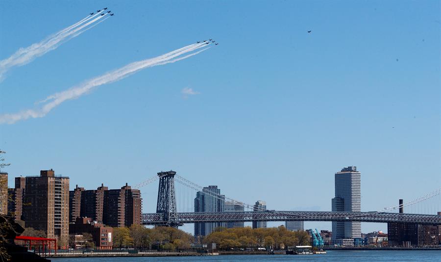 Una docena de aviones acrobáticos del Ejército del Aire y de la Marina de Estados Unidos surcaron el mediodía de este martes el cielo de la ciudad de Nueva York y la vecina Newark (en Nueva Jersey) para rendir tributo a todas las personas que se exponen diariamente al nuevo coronavirus SARS-CoV-2 y a los trabajadores de servicios esenciales.