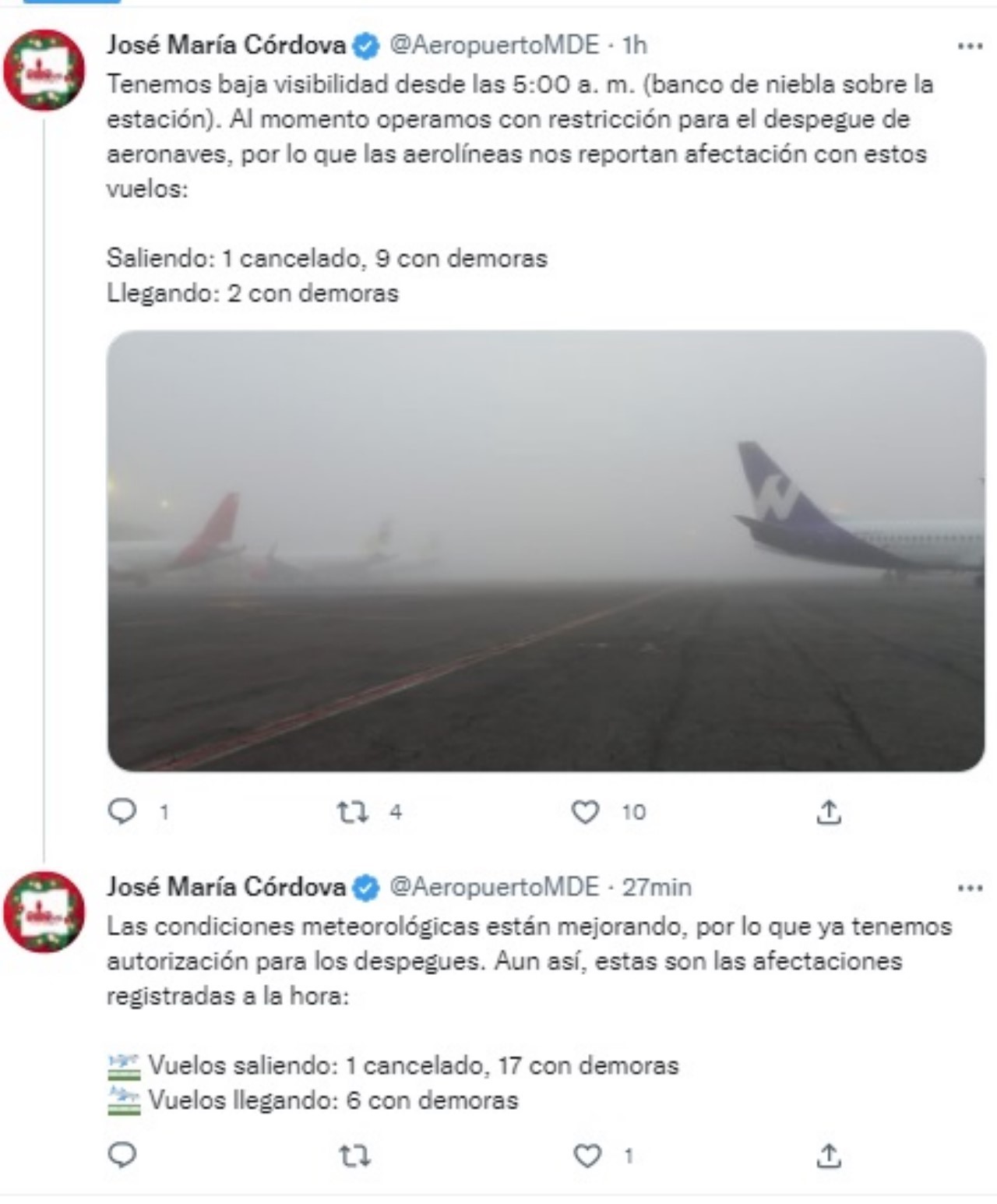 Por medio de su cuenta de Twitter, el aeropuerto internacional José María Córdova de Rionegro informó que debido a la “baja visibilidad desde las 5:00 a. m. (banco de niebla sobre la estación). Al momento operamos con restricción para el despegue de aeronaves”.