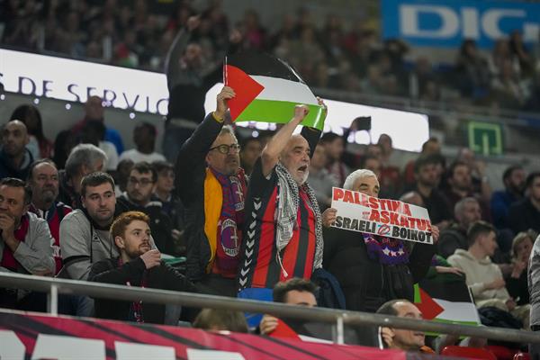 Algunos aficionados siguieron el llamamiento del colectivo BDZ Araba e Indar Baskonia y ocuparon su localidad en el minuto 5 del encuentro con numerosas banderas palestinas y un cartel que indicaba “Free Palestina (Palestina Libre)”, al que acompañaron con gritos de “Israel, genocida”.
