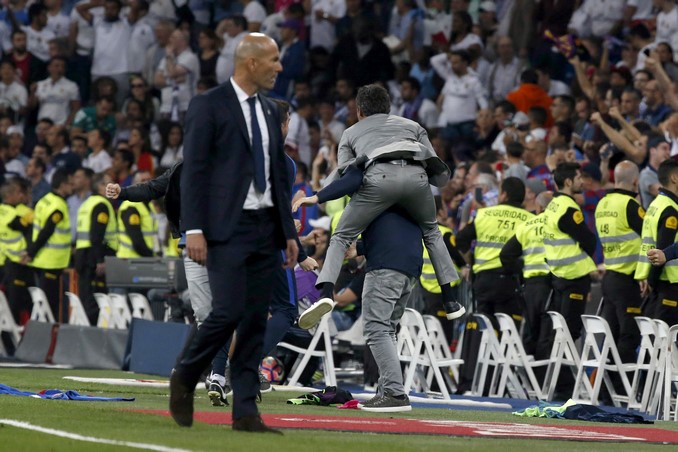 El entrenador del FC Barcelona, Luis Enrique Martínez (c), celebra el gol de la victoria de su equipo ante el Real Madrid, durante el partido correspondiente a la jornada 33 de primera división, que han disputado anoche en el estadio Santiago Bernabéu, en Madrid. EFE