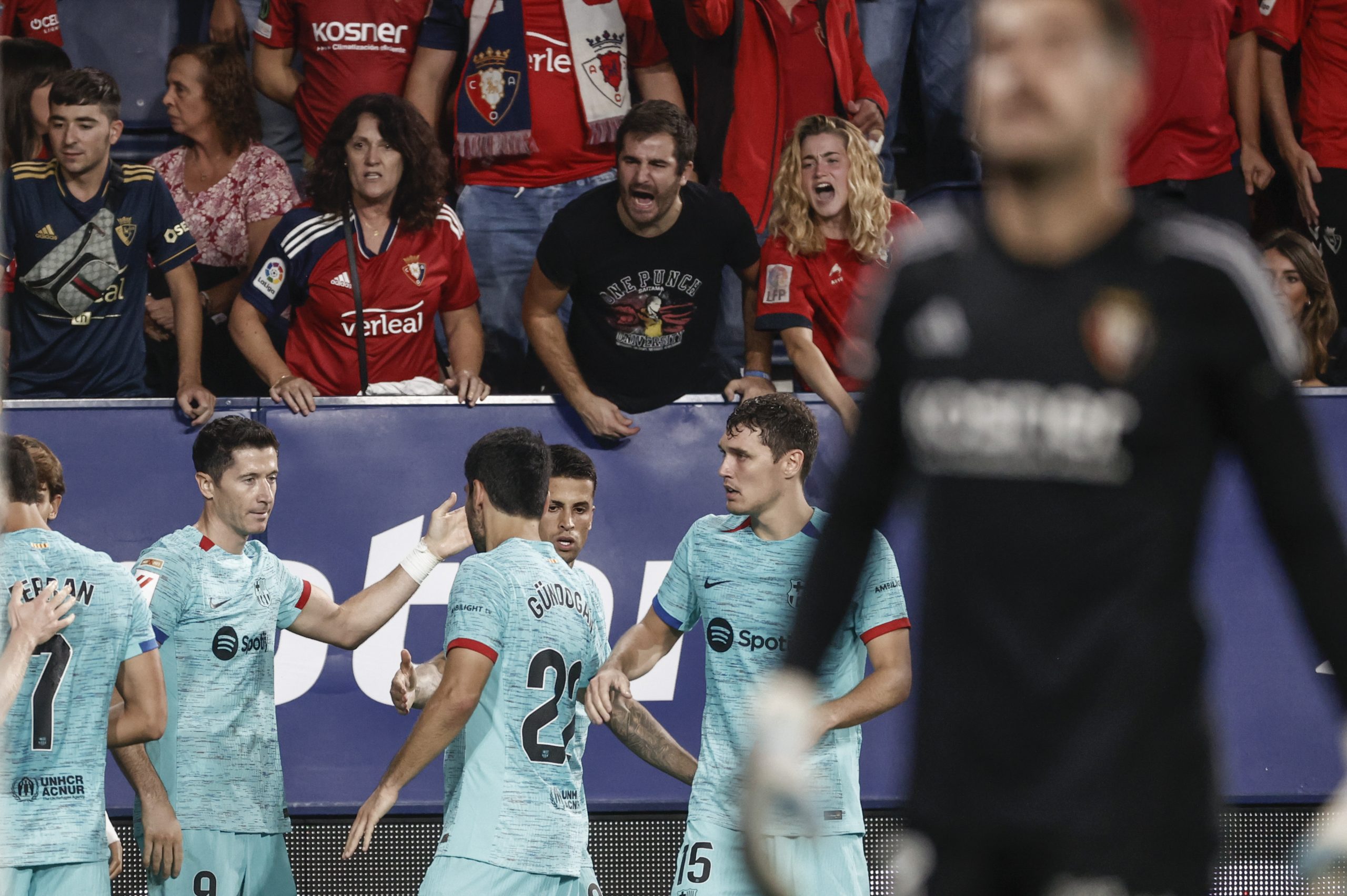 Obligado por el triunfo del cuadro del italiano Carlo Ancelotti, que encabeza la tabla con su pleno de cuatro victorias, el conjunto de Xavi Hernández no falló en El Sadar, donde volvió a sacar adelante un partido comprometido ante un competitivo Osasuna, que solamente cedió al final con un penalti de Alejandro Catena sobre Robert Lewandowski que aprovechó el delantero polaco.