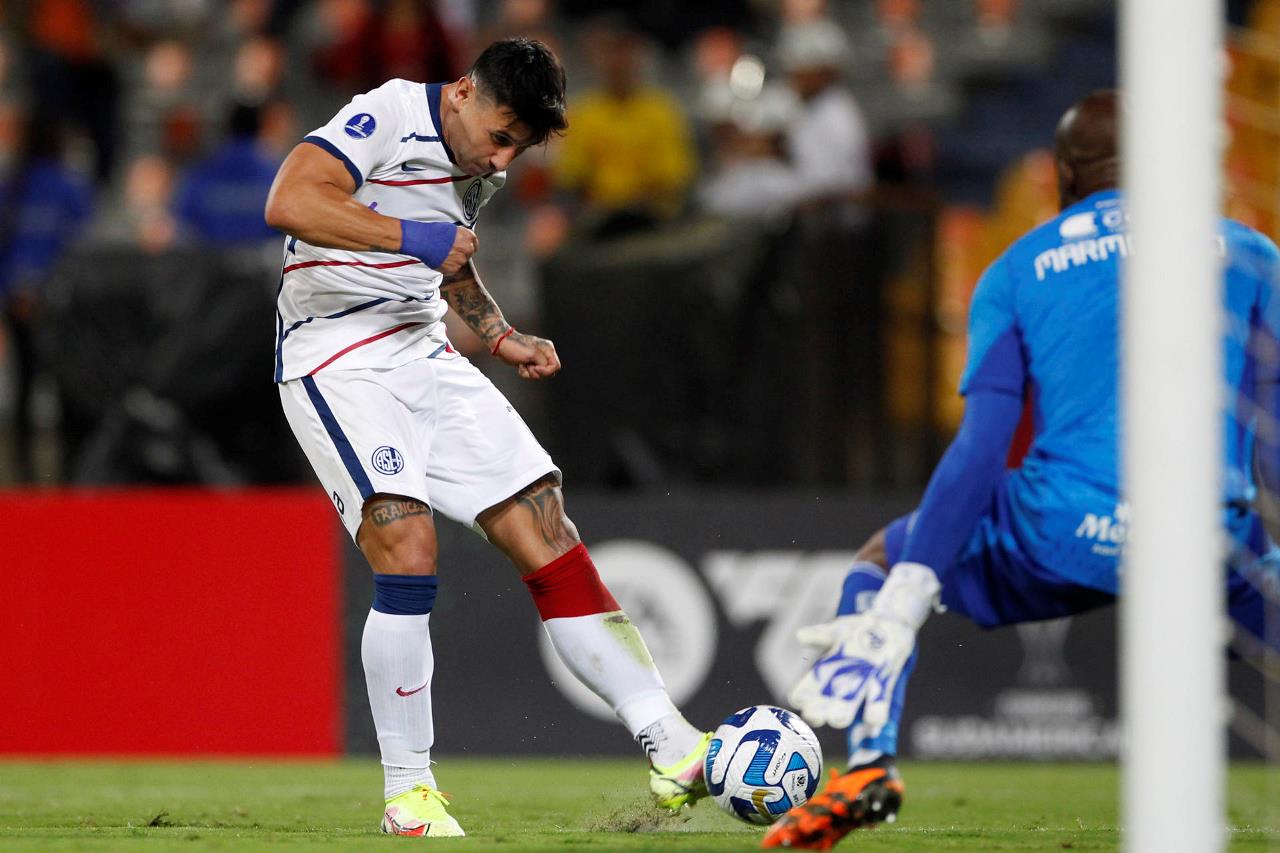 Adam Bareiro de San Lorenzo patea para anotar un gol hoy, en un partido de la Copa Sudamericana entre Deportivo Independiente Medellín (DIM) y San Lorenzo en el estadio Atanasio Girardot, en Medellín (Colombia). EFE/Luis Eduardo Noriega A.