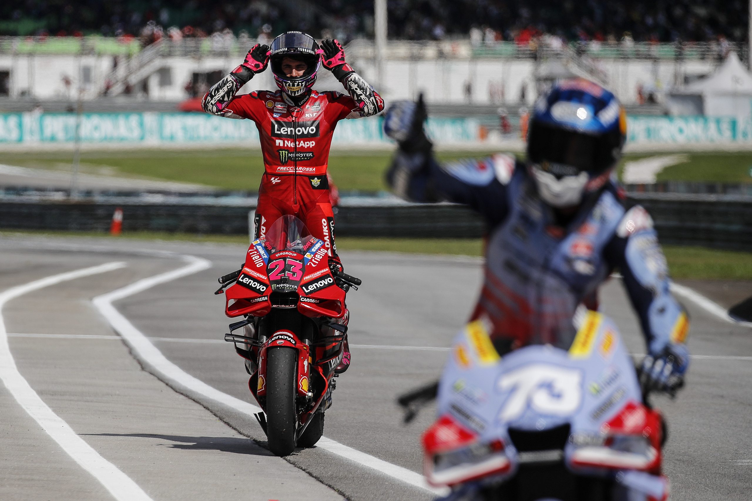 Sepang (Malasia), 12 nov (EFE).- El italiano Enea Bastianini (Ducati Desmosedici GP23) consiguió su primera victoria como piloto oficial de Ducati en el Gran Premio de Malasia de MotoGP, en el que su compañero de equipo Francesco Bagnaia (Ducati Desmosedici GP23) frenó las aspiraciones al título del español Jorge Martín (Ducati Desmosedici GP23) al acabar por delante de él.